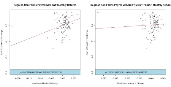 The top chart shows non-farms plotted with the S&P 500. It is interesting to note that in the % change charts there is a crash in the market around mid 08 this is then followed by a crash in the non-farms numbers. Although not a very rigorous analysis it looks like non-farms numbers LAG the market.