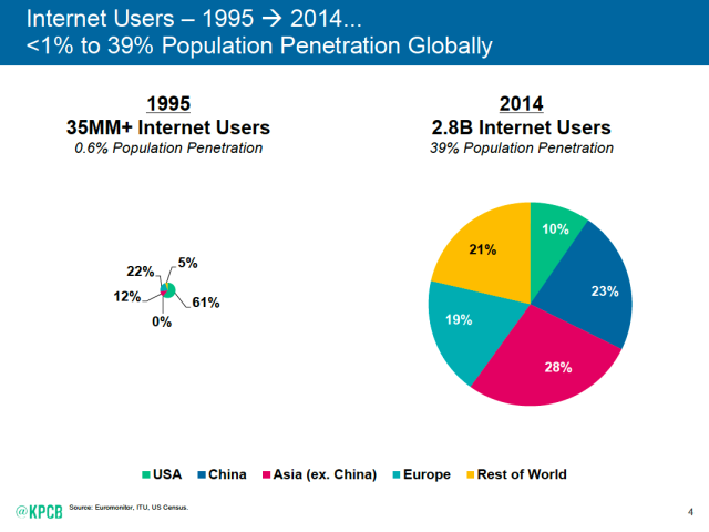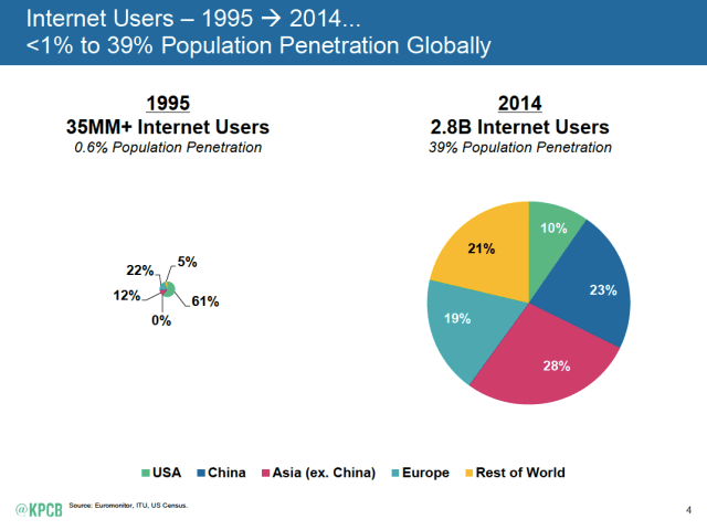 Here’s how Meeker sets the stage: Two-thirds of a generation into the Internet, there were 2.8 billion users as of 2014, up from 35 million in 1995.