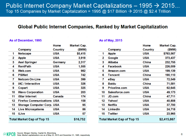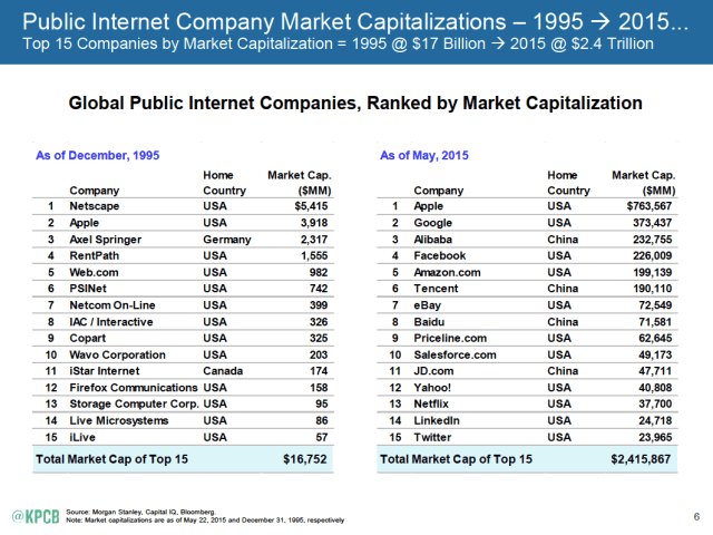 In 2015, the market capitalization of the top 15 Internet companies is a combined $2.42 trillion, up from $16.8 billion in 1995.