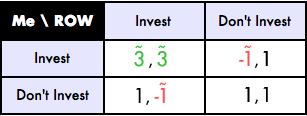 If only everyone would invest, there’s a pretty good chance that we’d all be better off, on average our investments would succeed. But if an individual invests while the rest of the world does not, the expected outcome is a loss. (Colored values wearing tilde hats represent stochastic payoffs whose expected value is the number shown.) There are two equilibria, a good one in the upper left corner where everyone invests and, on average, succeeds, and a bad one in the bottom right where everybody hoards and stays poor. If everyone is pessimistic, we can get stuck in the bad equilibrium. Animal spirits are game theory.